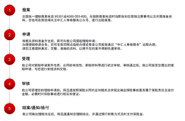 一、 保險產品承保公司設有省級分支機構和落地服務機構的省(自治區、直轄市、計劃單列市)清單。 https://www.zhonghuilife.com/service/index.html?id=76-4b65a7332c7f1906289479c93990bb39&menu=3&contentType=servTree 二、保險產品承保公司全國統一的客戶服務及投訴方式,包括客服電話、在線服務訪問方式、理賠爭議處理機制和工作流程等。 (一)中匯全國統一的客戶服務及投訴方式:保險產品承保公司全國統一的客戶服務電話:95301。 (二)投訴方式: 1.客服電話:95301或4000 555 800 2.電子郵箱:service@zhonghuilife.com 3.移動客戶端:微信關注“中匯人壽微服務” 4.官網:www.zhonghuilife.com (三)理賠工作流程: