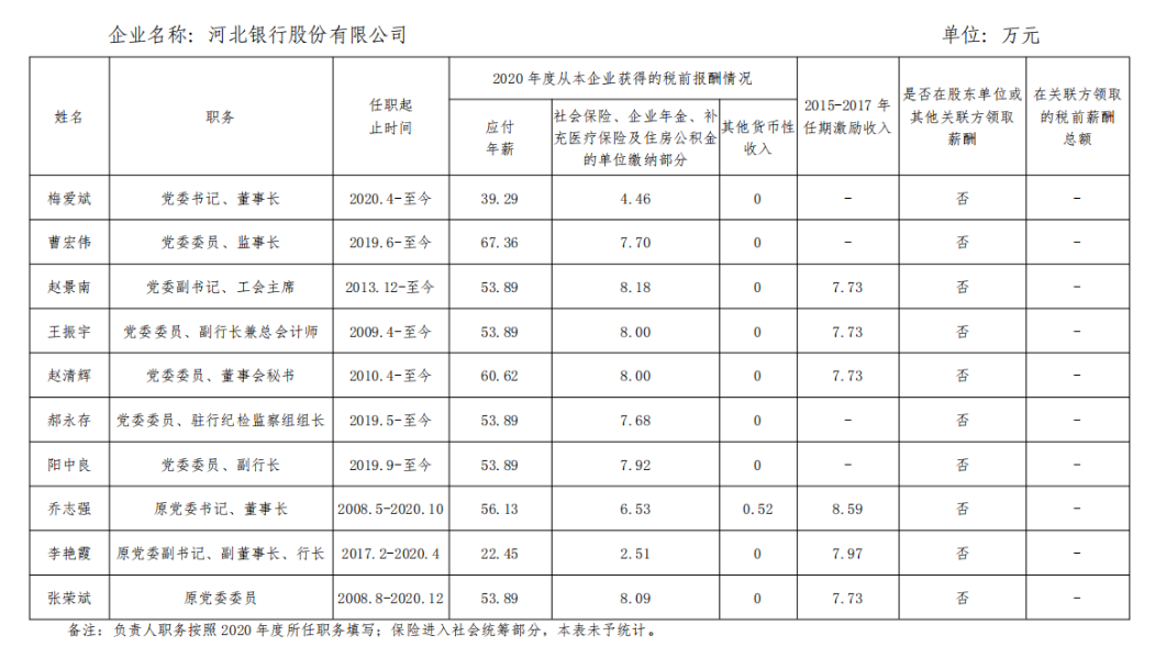 河北省省屬國有企業負責人2020年度薪酬信息披露表